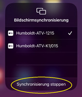Der AppleTV fährt nach 15 Minuten automatisch in einen Ruhemodus. Er bleibt damit weiterhin in der Liste der Bildschirmsynchronisierung sichtbar und kann durch weitere Benutzerinnen oder Benutzer gestartet werden. Sie deaktivieren nur den Beamer.